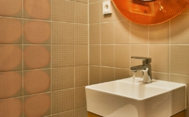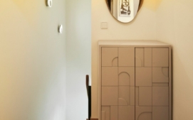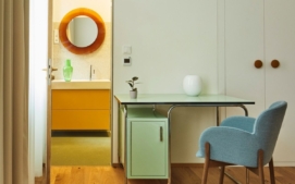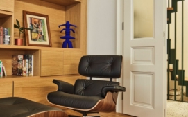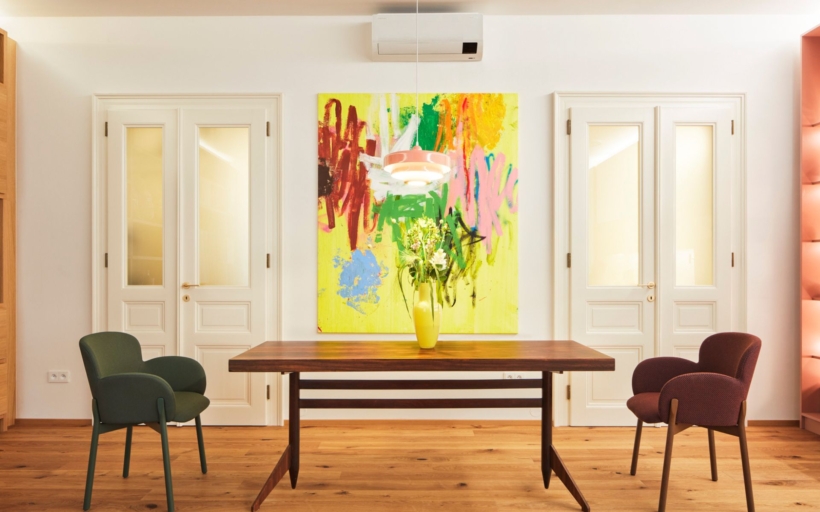 Nábytek v celém prostoru je vintage a pochází ze čtyřicátých a padesátých let. Barva se tak objevuje i na jednotlivých solitérech ve vybavení, stejně jako v samotném umění.