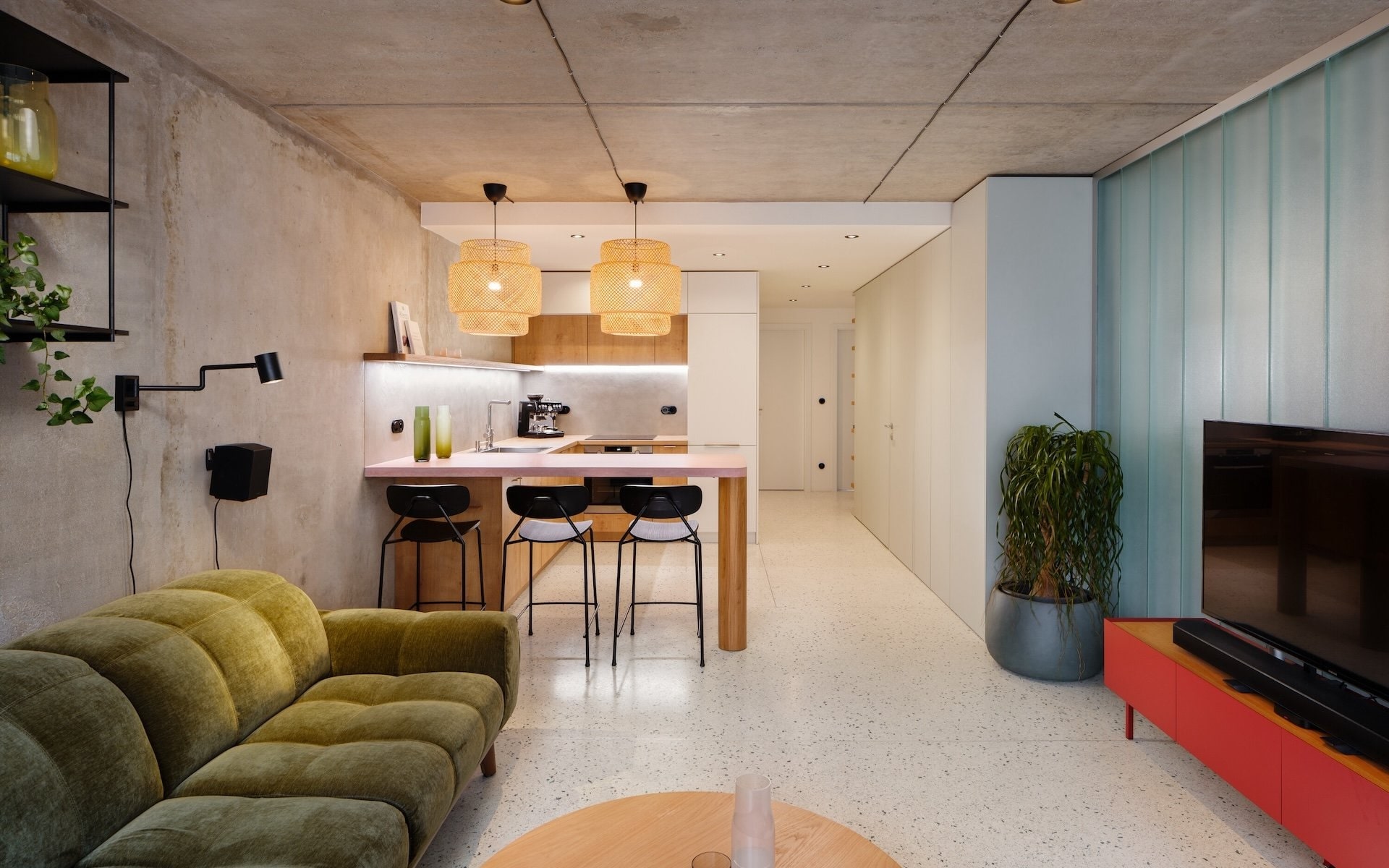 Byt v paneláku jinak, lépe, zábavněji. Místo umakartu sklo, zdi nahradily závěsy a lino terazzo