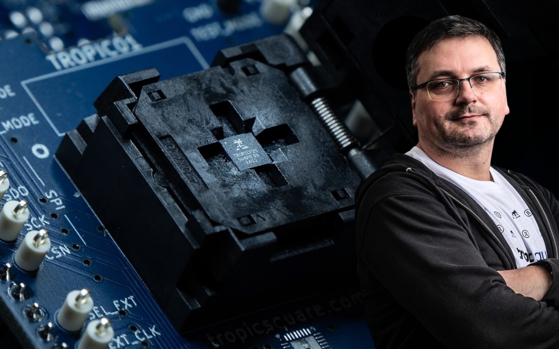 Spoluzakladatel Tropic Square Jan Pleskač, na pozadí je čip Tropic01