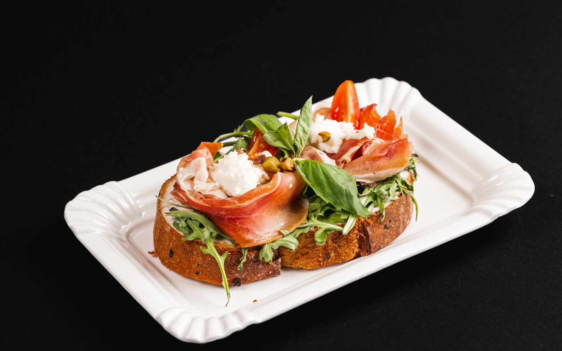 Chlebíček Mafián s parmskou šunkou, mozzarellou a pistáciemi