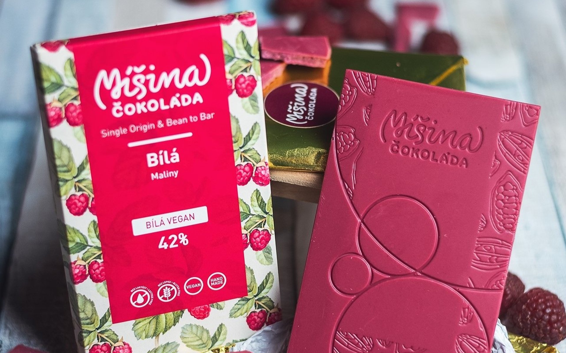 Bílá veganská čokoláda s malinami od firmy Míšina čokoláda