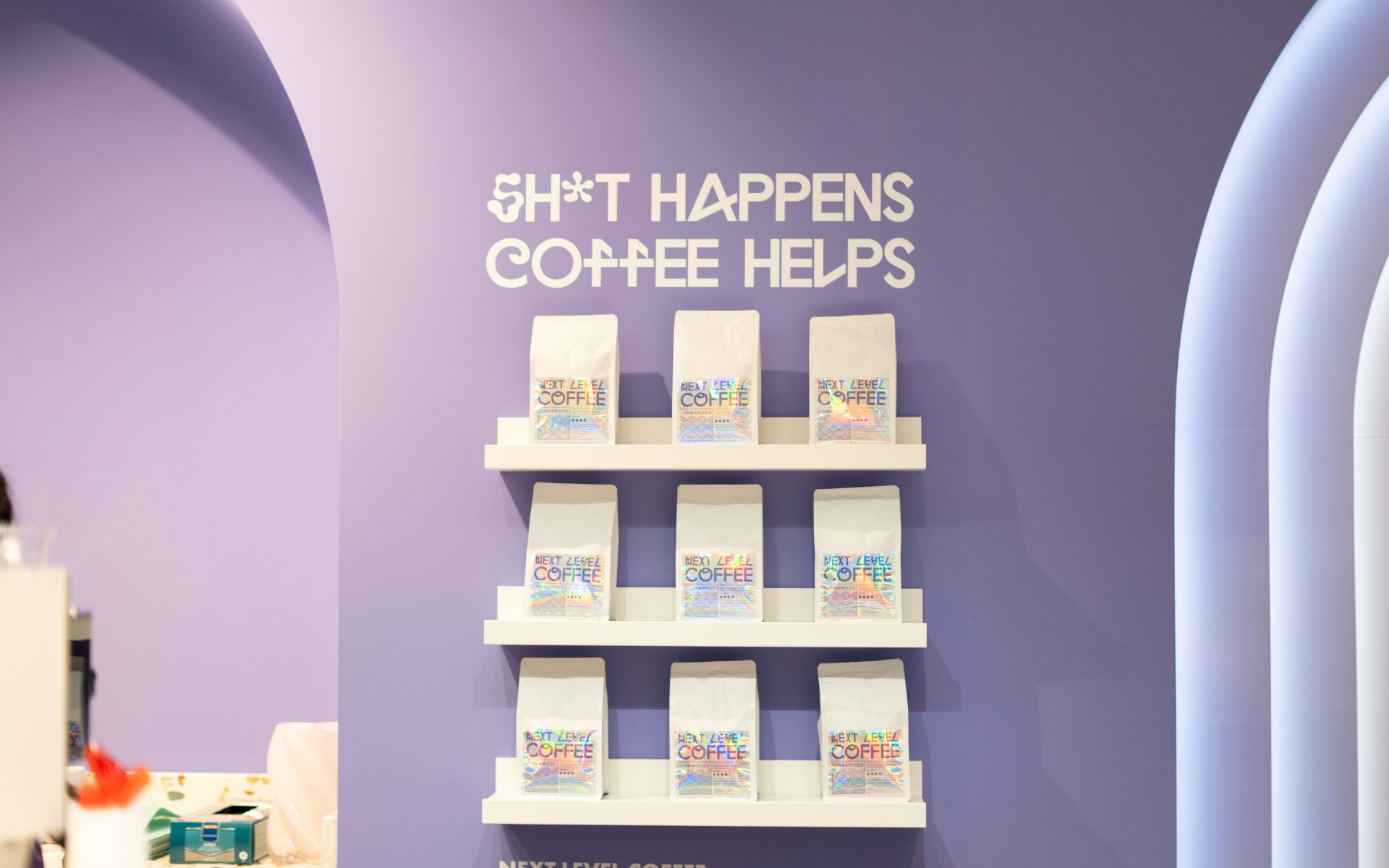 Interiéru obchodu dominuje fialová barva