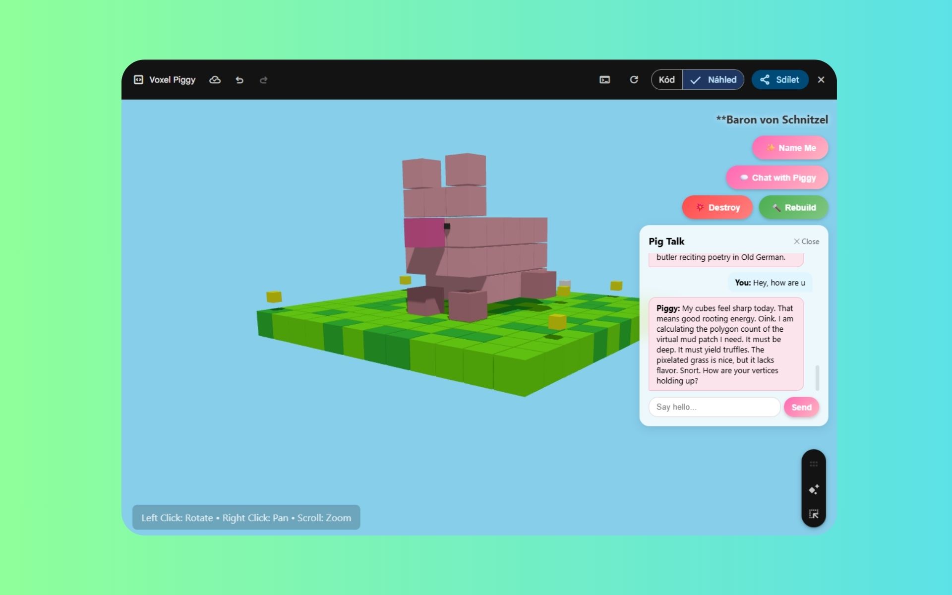 Poradí si ale i se složitějšími úkoly, třeba vytvořením aplikace s voxelovým prasetem, které dostalo i jméno