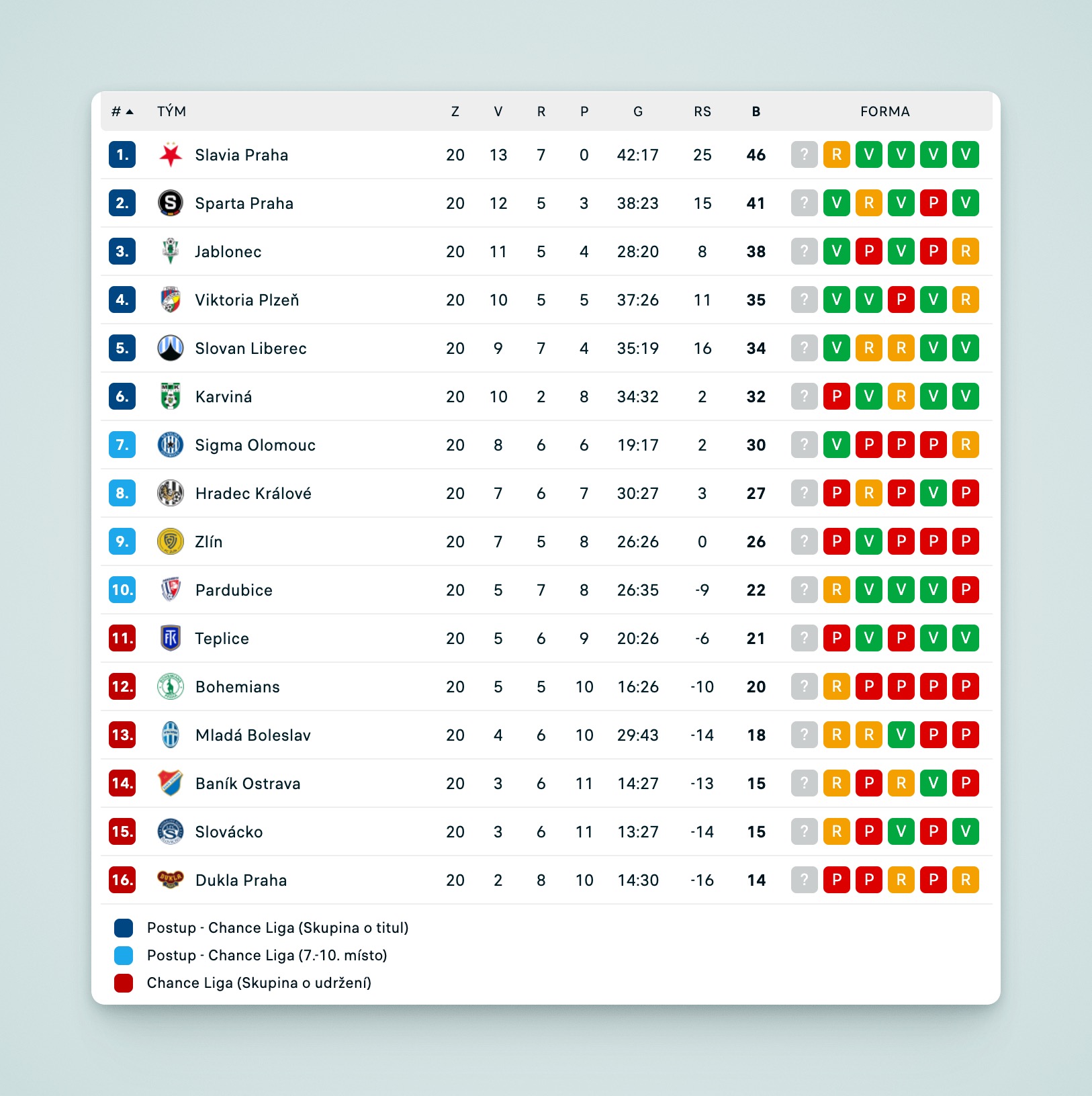 Aktuální tabulka Chance ligy na grafice Livesportu