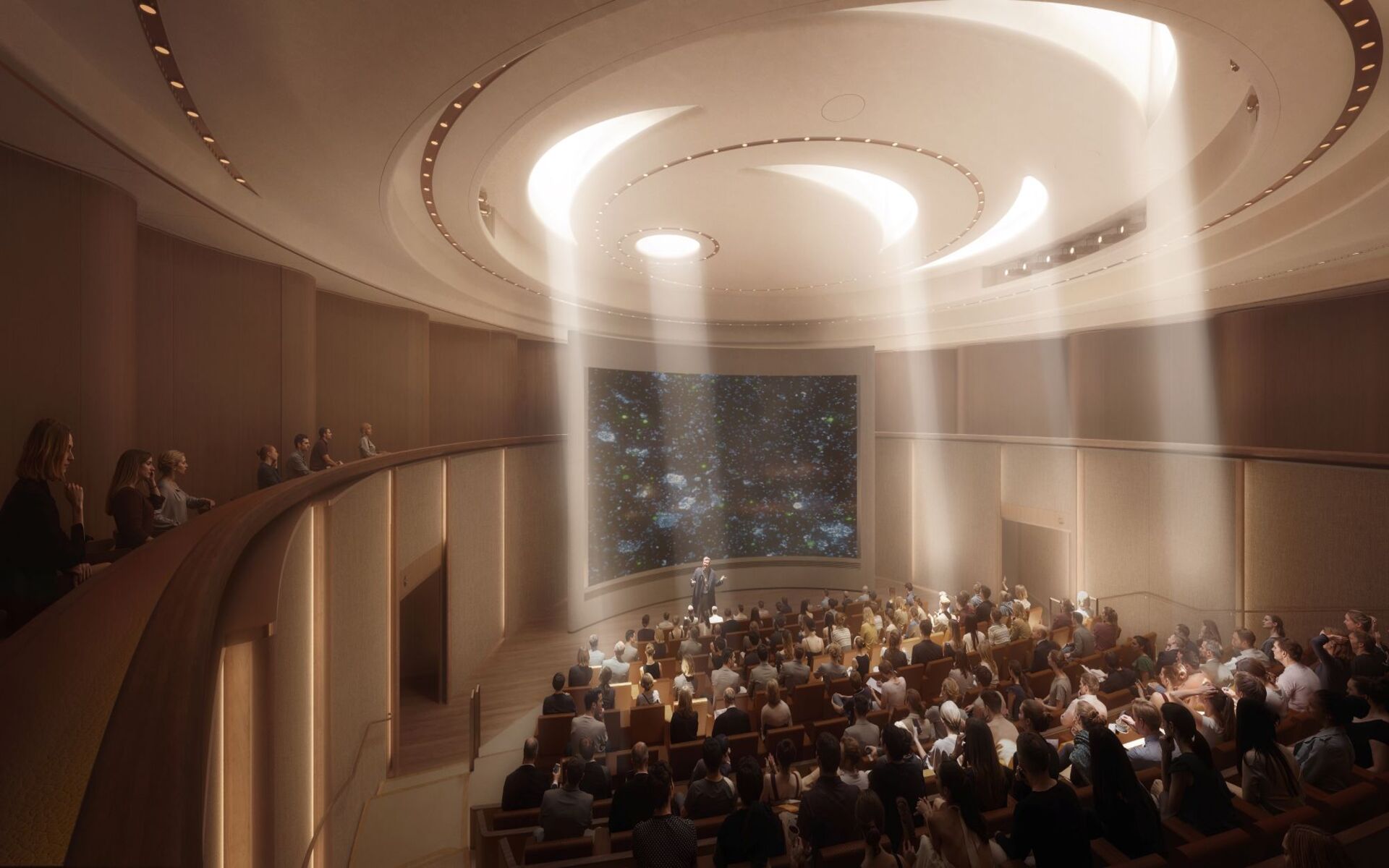 Vnitřní prostor kopulovitého auditoria s prosvětleným stropem, které bude sloužit jako hlavní dějiště pro přednášky