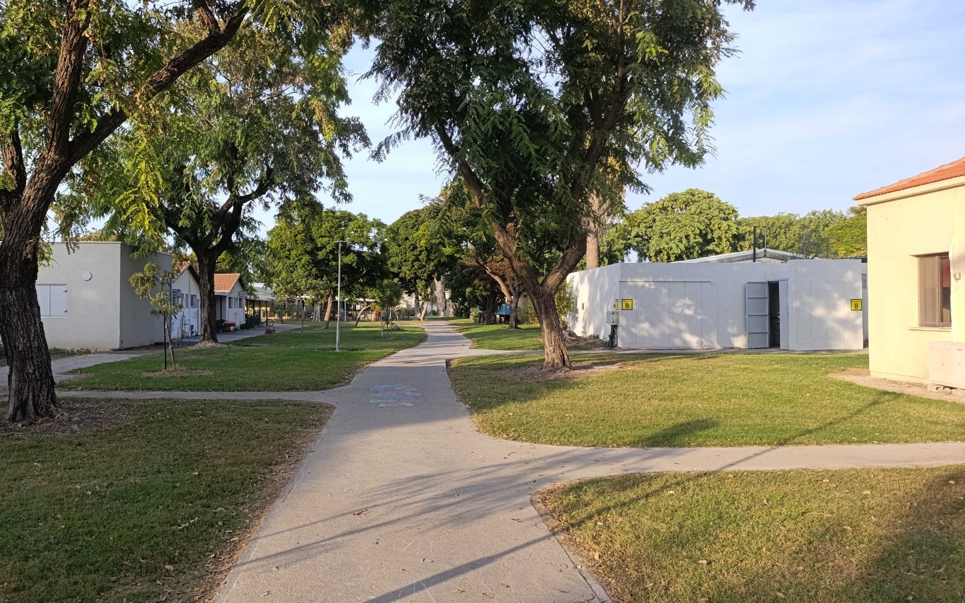 Pohled na kibuc Kfar Masaryk, bílá budova napravo slouží jako bunkr