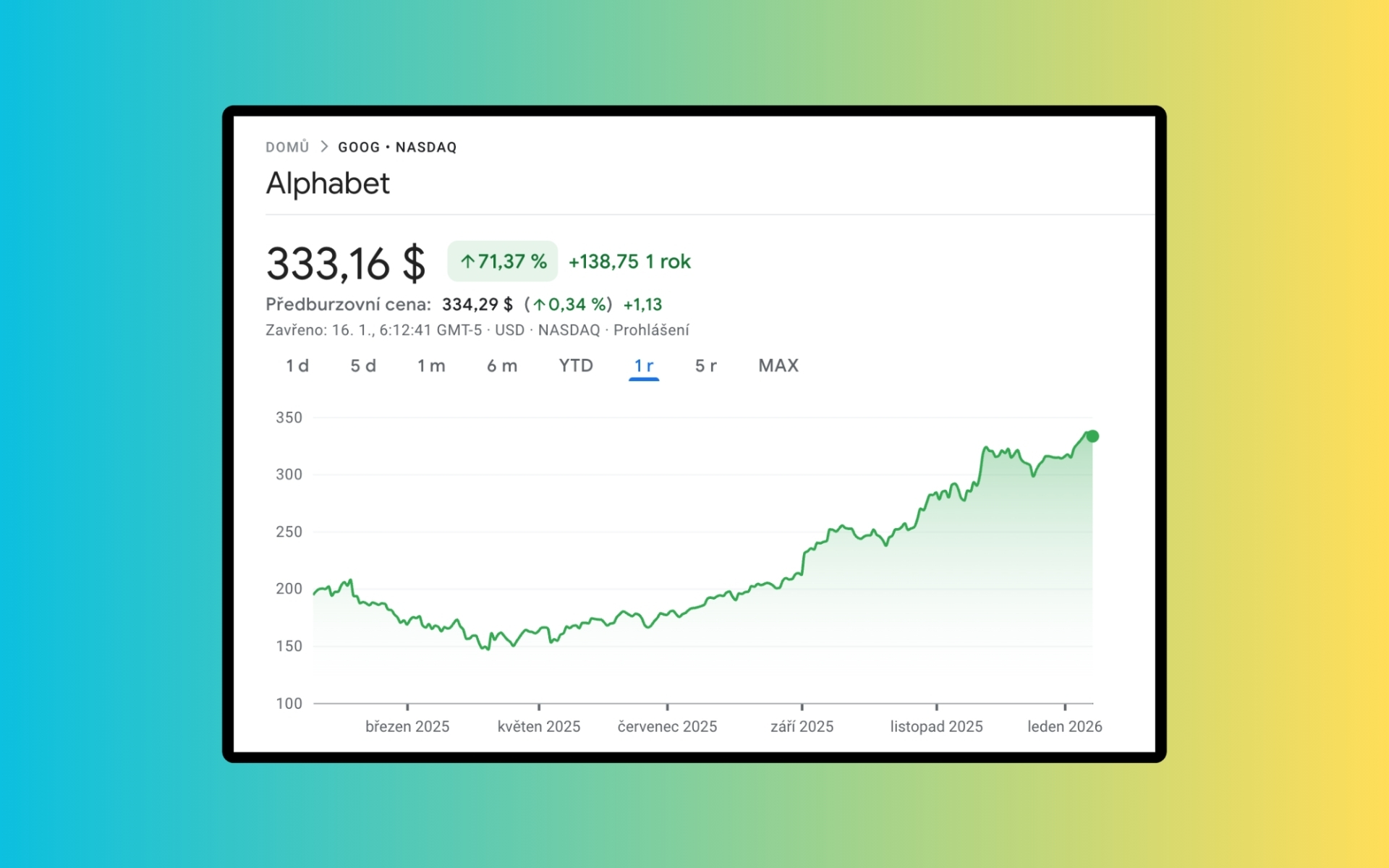 Vývoj akcií Googlu za poslední rok k pátku 16. ledna 2026