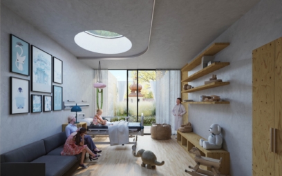 Dodává, že každý pokoj v moderní budově má svou vlastní soukromou terasu se zahradou, kterou představuje jako pokoj pod širým nebem s výhledem na historickou část areálu. Z opačné strany moderní budovy budou moct pacienti vstoupit do zeleně venkovní společné zahrady.