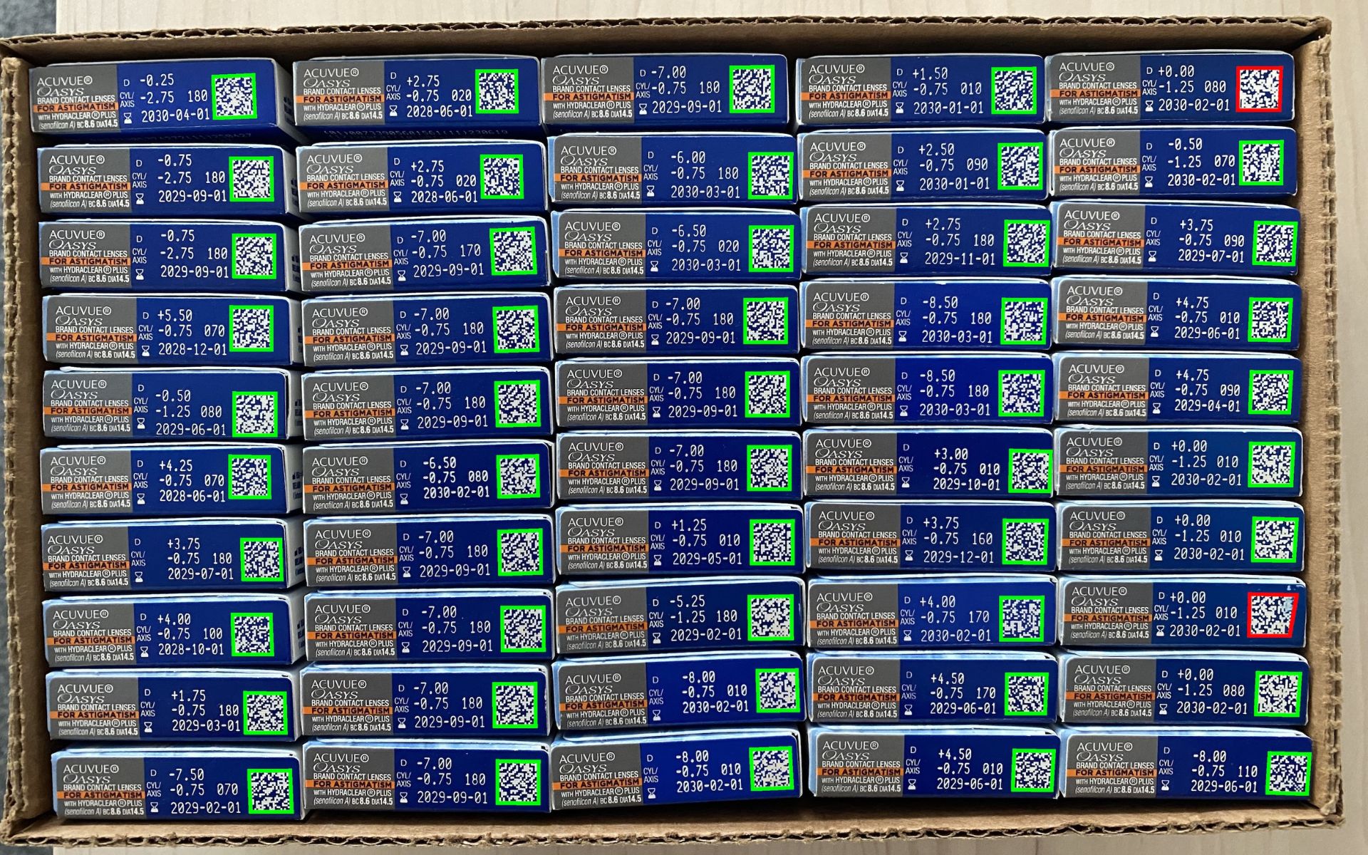 Fotografie balíku s kontaktními čočkami. Zeleně jsou úspěšně naskenované kódy a červeně ty, které se přečíst nepodařilo
