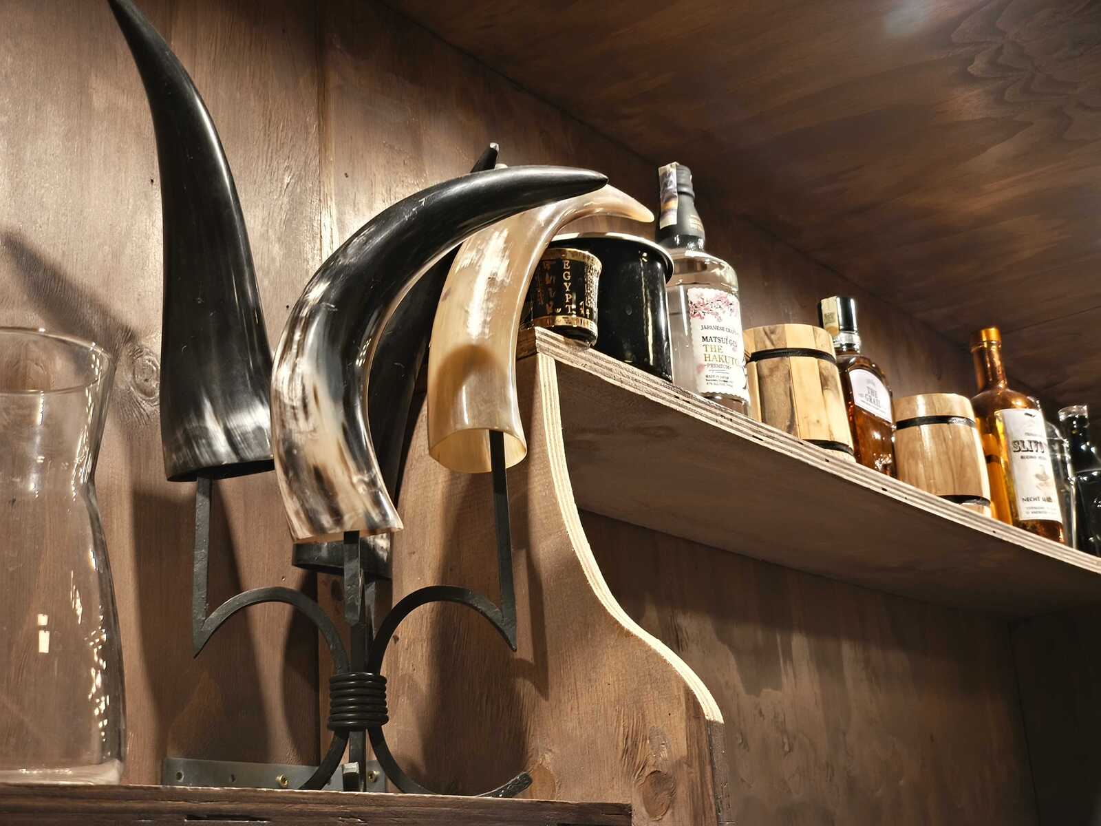 Teplé světlo zářivky v hlavní místnosti padá na železný držák s leštěnými kravskými rohy, ze kterých se dá pít pivo