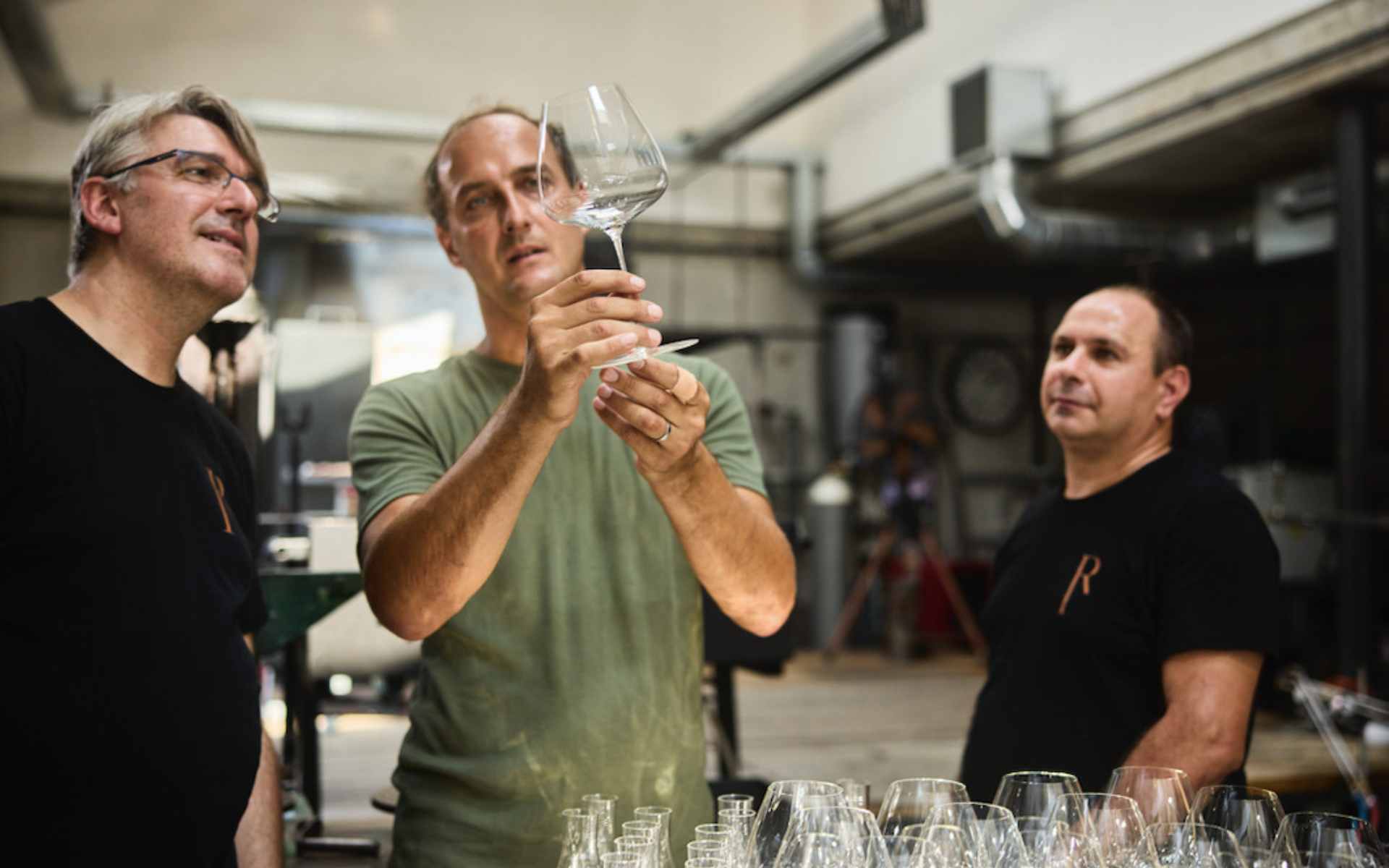 Zleva: Sklářský mistr Miloš, majitel Adam a sklář Jan