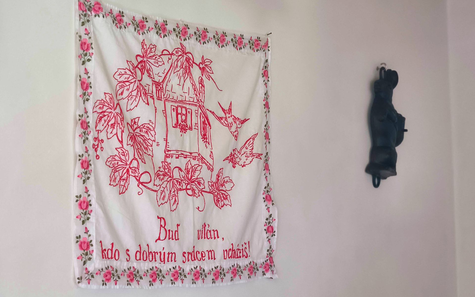 Zvláštní kouzlo interiéru dotváří závěsné ubrousky, takzvané nástěnky, s vyšitými lidovými říkankami a vtipnými motty