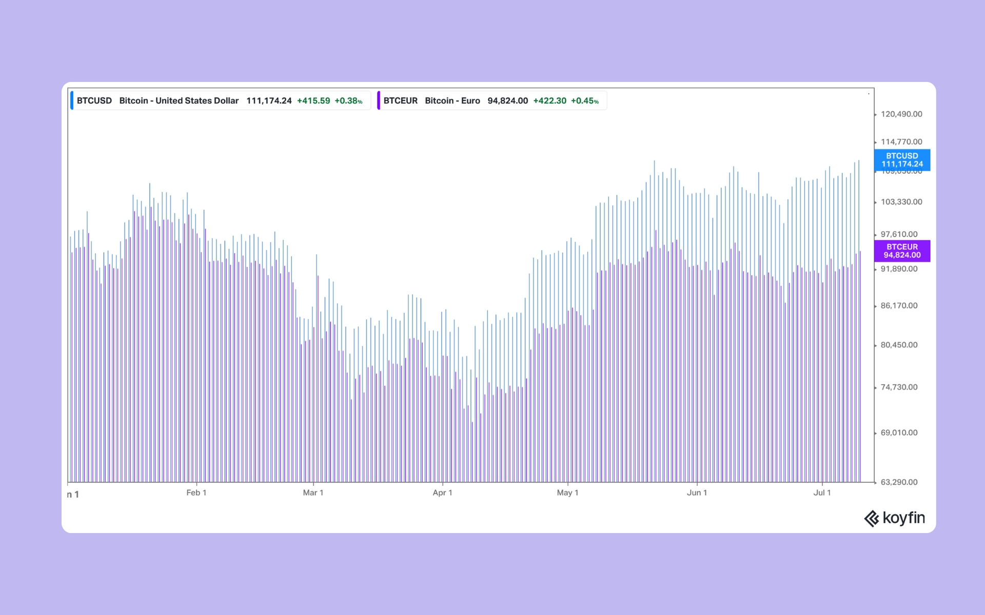 Letošní vývoj hodnoty bitcoinu v dolarech (světle modře) vs. hodnoty bitcoinu v eurech (fialově).