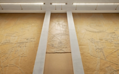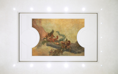 Zde se konečně dostáváme k nejnovějším iPhonům, iMacům a mnoha dalším zařízením, které svým umístěním do rozsáhlého prostoru jako by decentně upozorňovaly na to, že jsme v Římě roku 2021, ne 1890. Pro přímý kontrast stačí od stolů s telefony a počítači vzhlédnout ke stropu, kde jsou dlouho schovaná renovovaná díla Fabia Cipolly a Ettore Balleriniho z počátku 20. století. Na stěně hned pod nimi jsou zase na zlaté ploše vyrytá graffiti Afro Basaldelly z roku 1950.