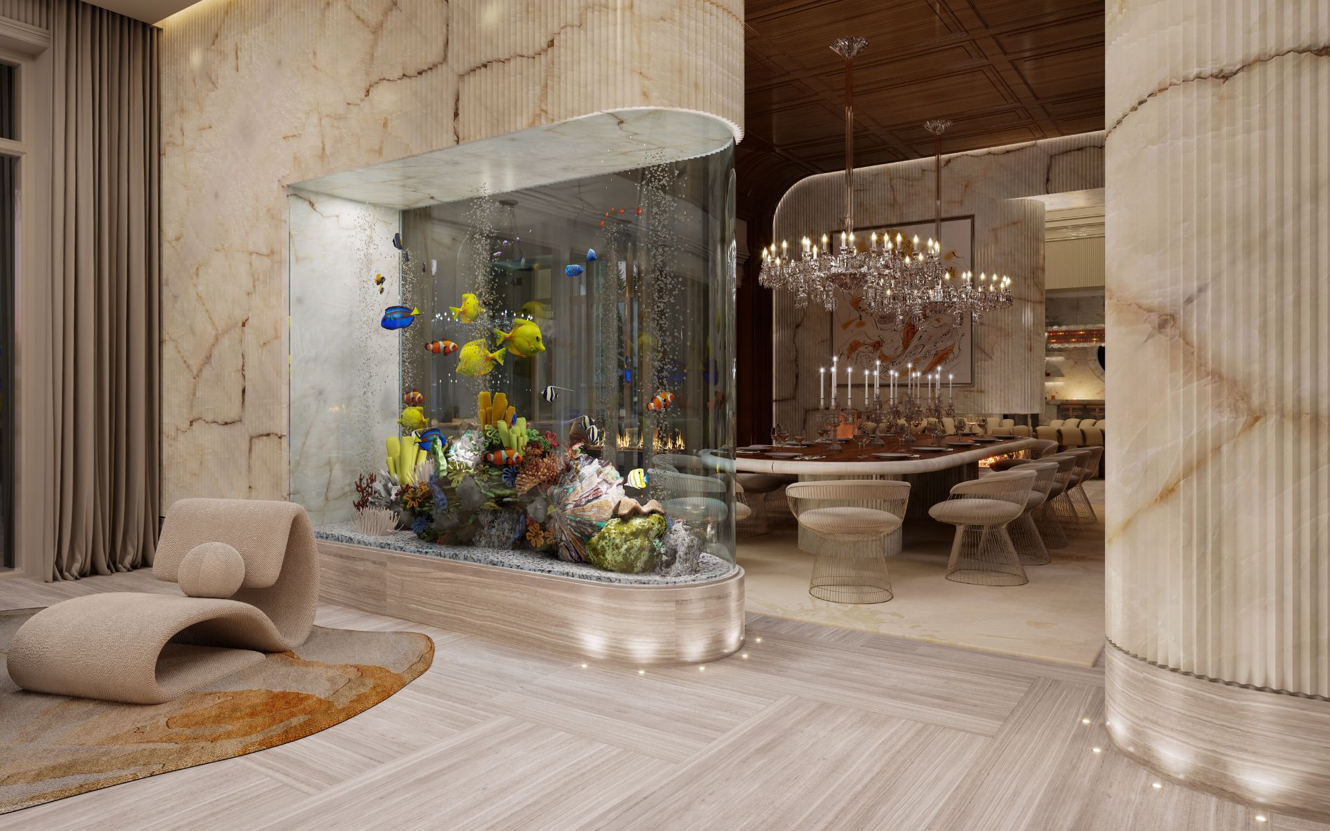 Akvárium s objemem přes 5 600 litrů je součástí interiéru vily