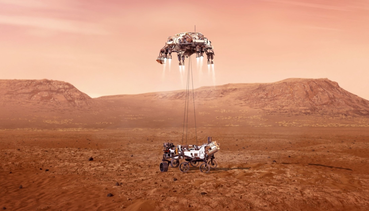 Klíčový okamžik. Vozítko Perseverance dosedá na Mars pomocí „nebeského jeřábu“