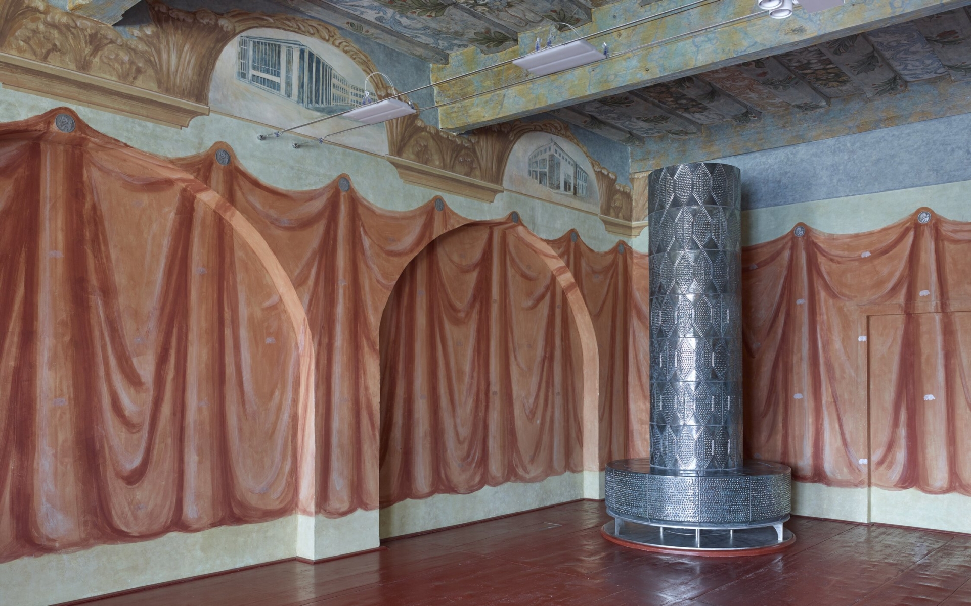 Jeden z malovaných sálů se stříbrnými kamny