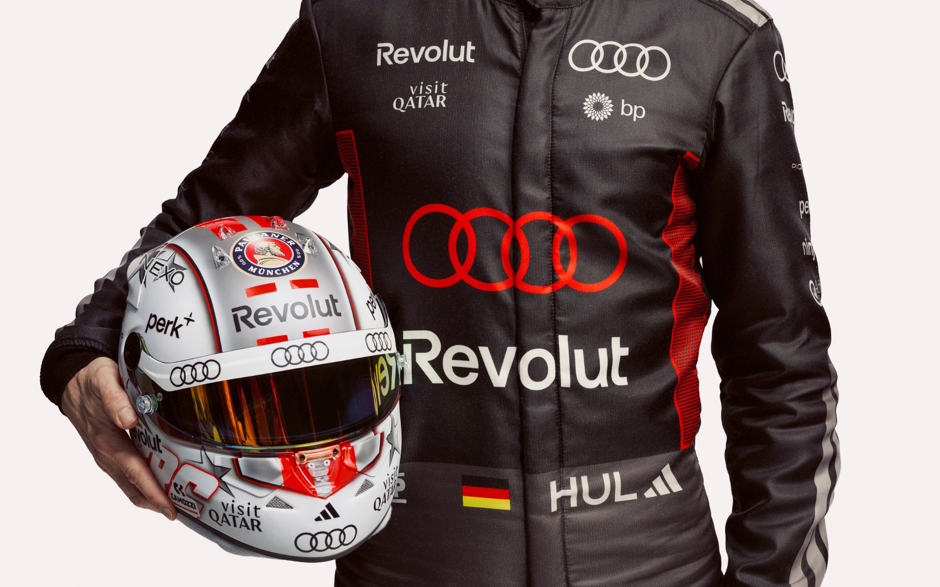Výrazná logo Audi a Revolutu na kombinéze