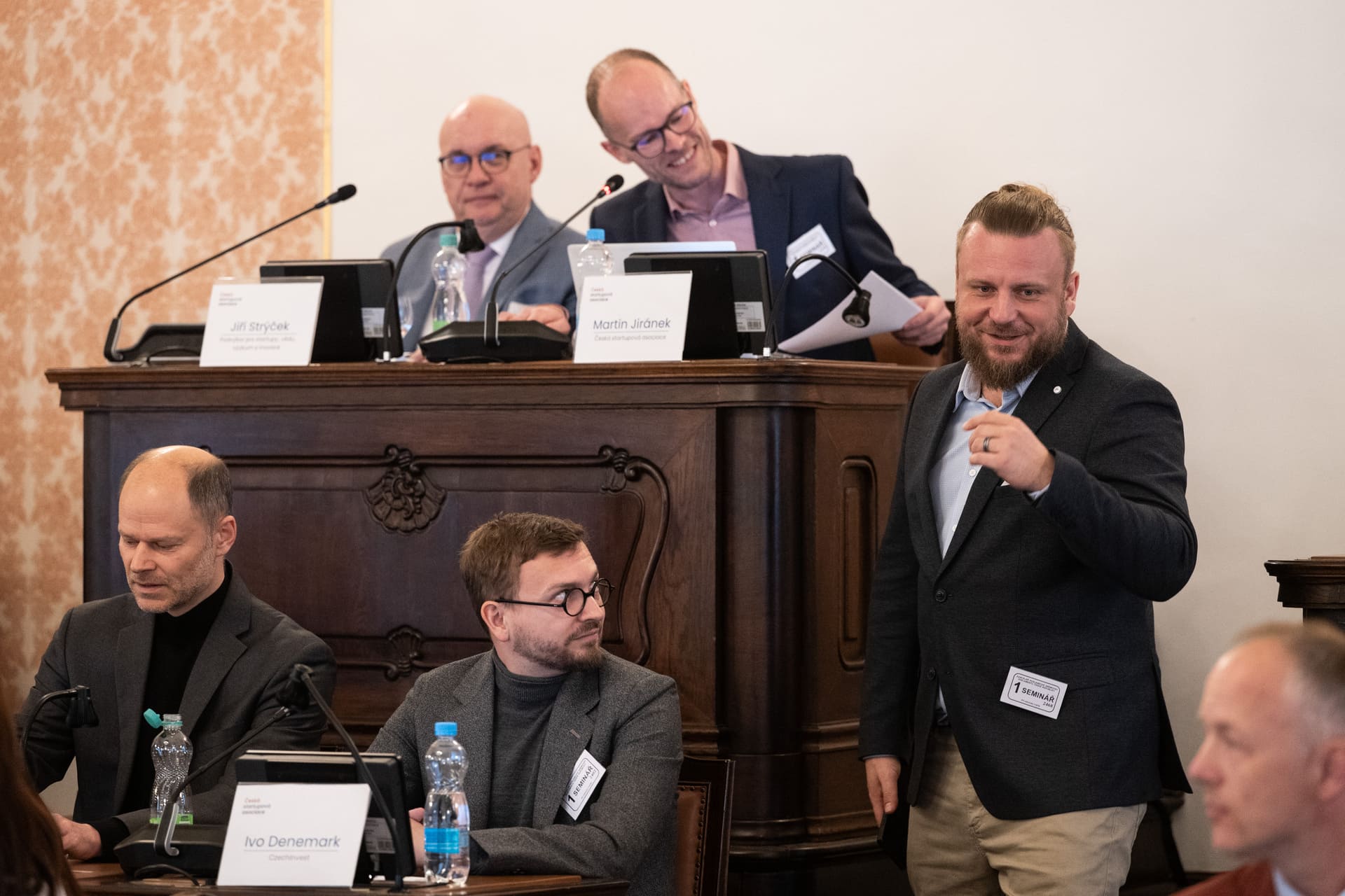 Startupisté, investoři a podnikatelé v poslanecké sněmovně. Na snímku jsou vidět Vojta Roček (Presto Ventures), Radek Špicar (Svaz průmyslu a obchodu), Ondřej Tomek (Impulse Capital), Martin Jiránek (Česká startupová asociace), Ivo Denemark (CzechInvest) a Jiří Strýček (podvýbor pro startupy, vědu, výzkum a inovace)