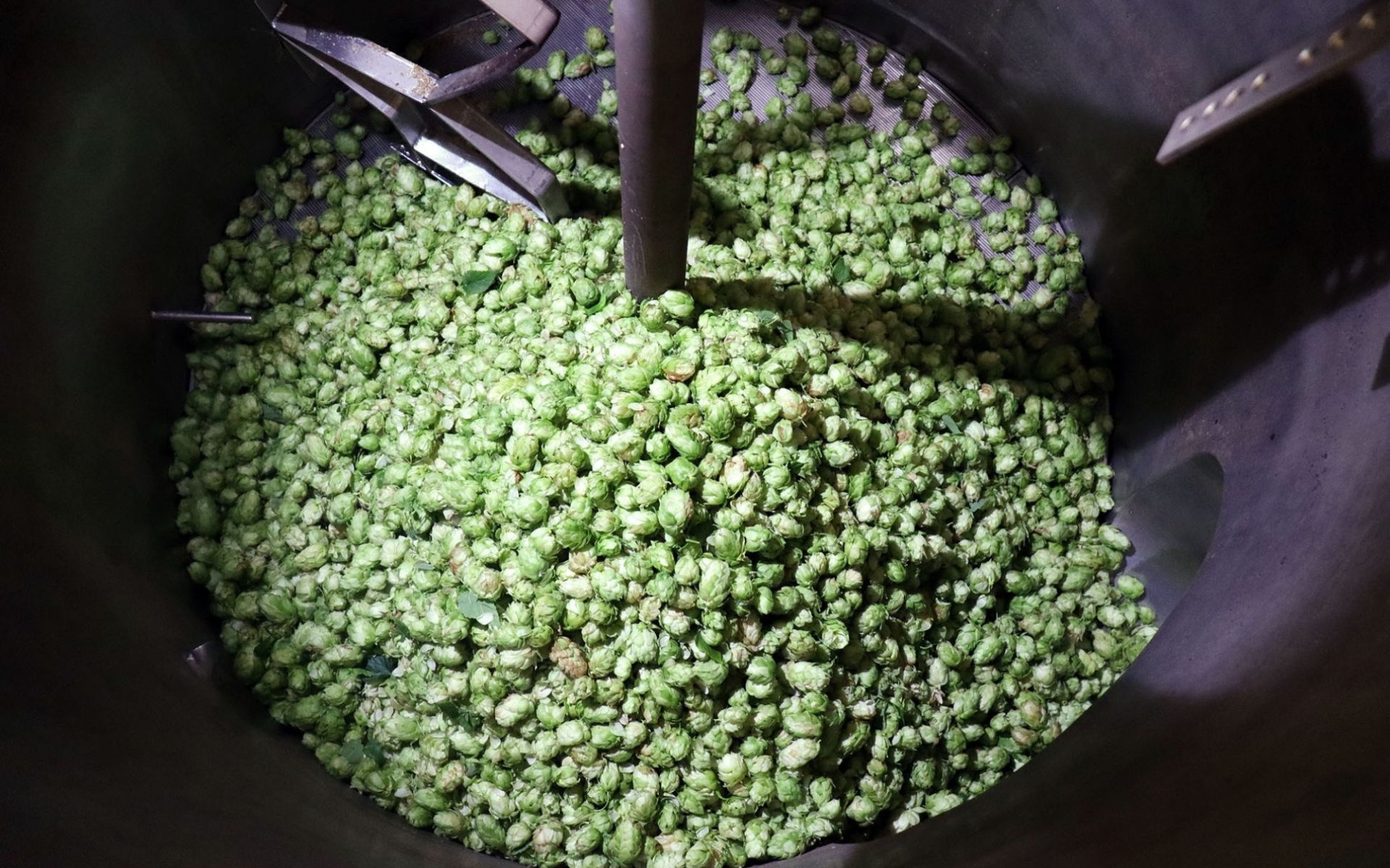 Čerstvě sklizený chmel ve scezovací nádobě při vaření sezónního fresh hop lageru