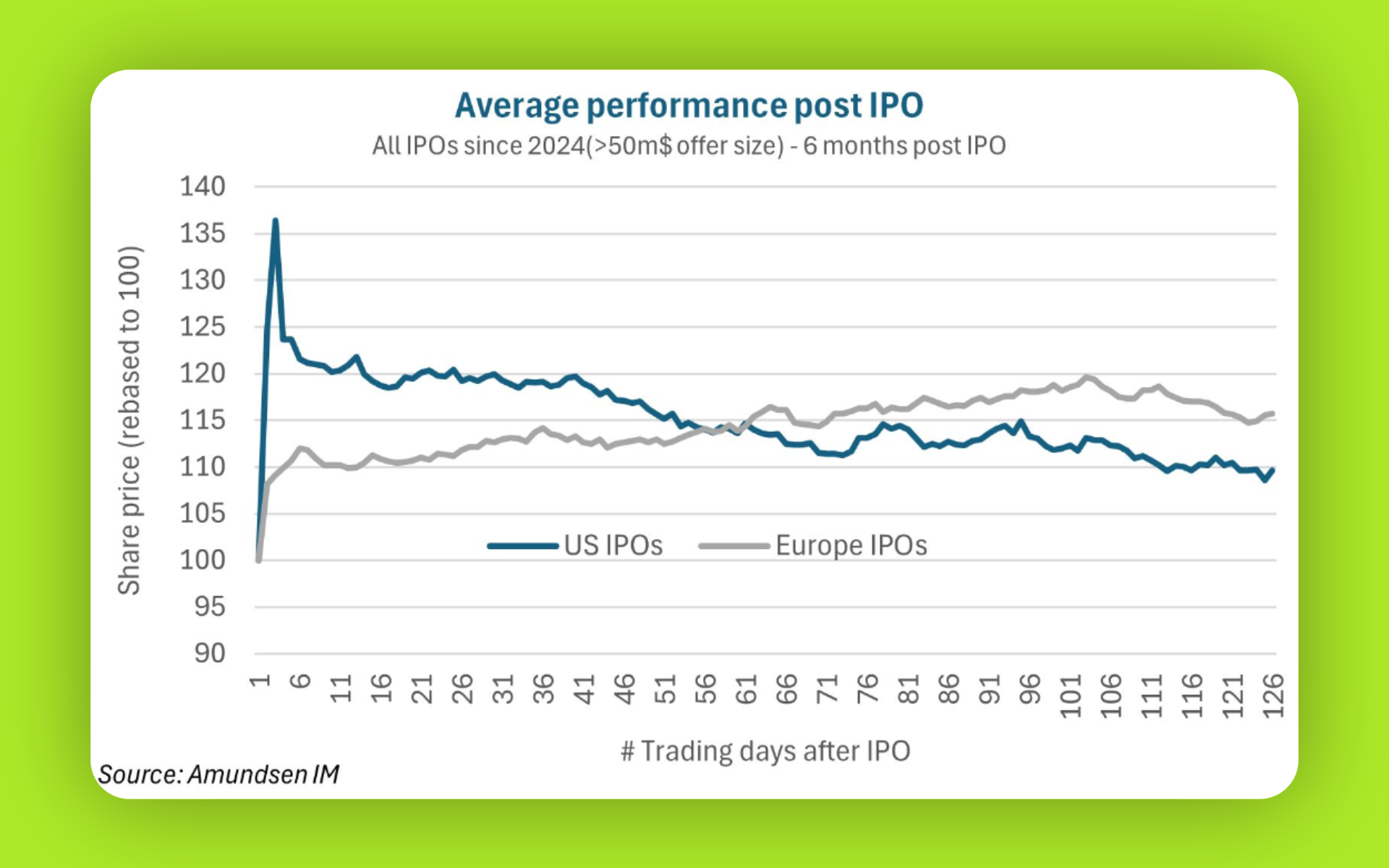 Průměrná výnosnost firem po vstupu na trh rozdělena na regiony US versus Evropa