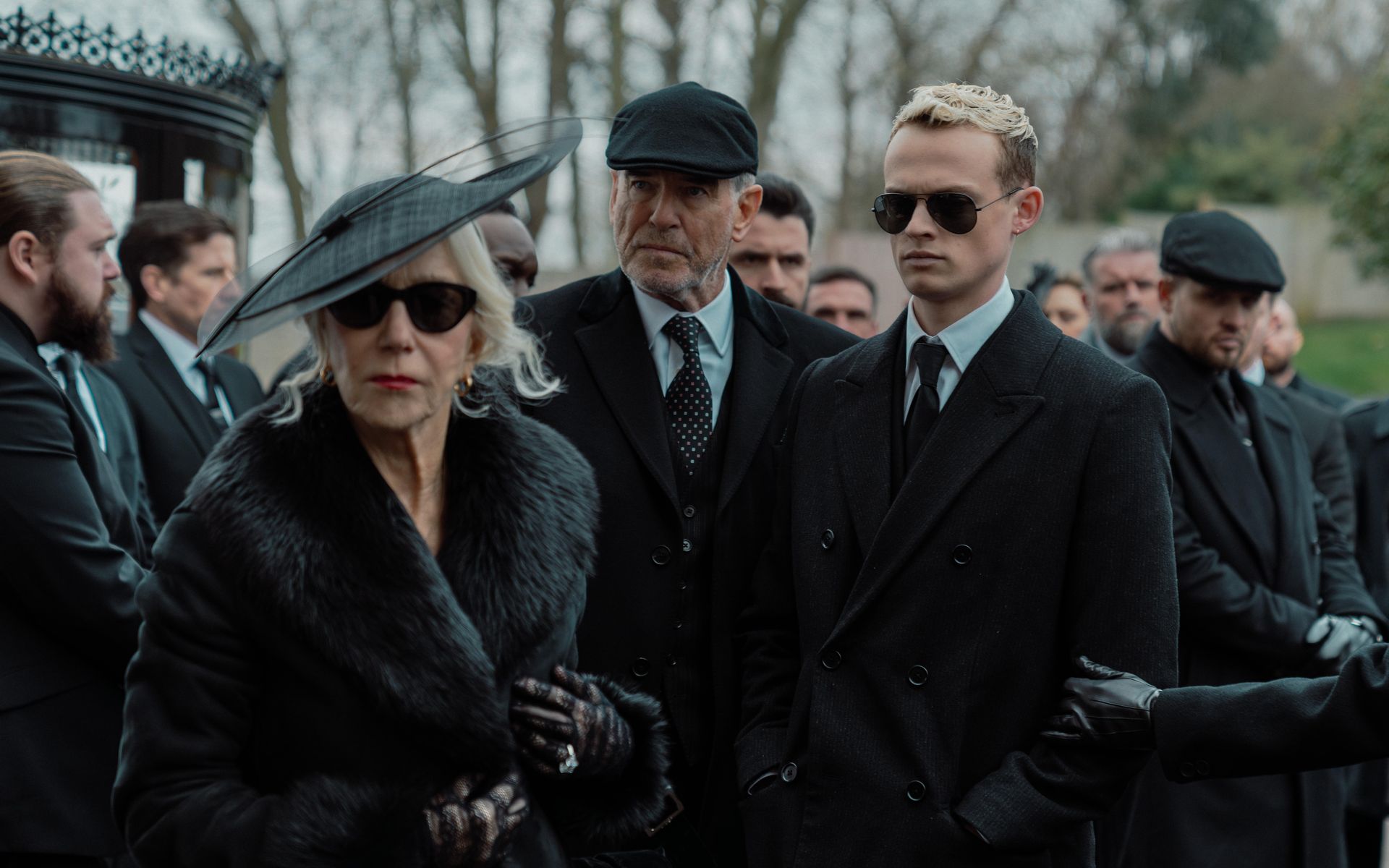 Helen Mirren a Pierce Brosnan jako Maeve a Conrad, hlava mafiánské rodiny Harriganových ze seriálu MobLand. A vedle nich Eddie Harrigan, nenáviděníhodný hajzl