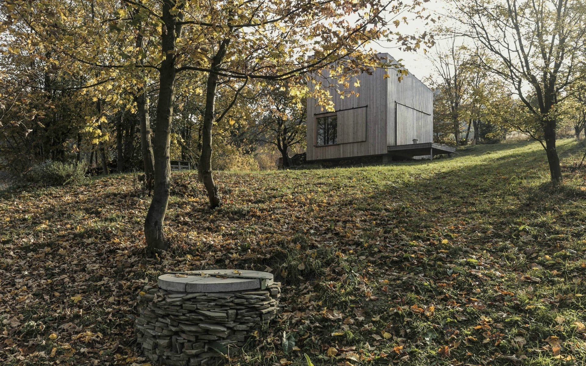 Pozemek je svažitý, chata jej proto využívá i pro svůj sklep