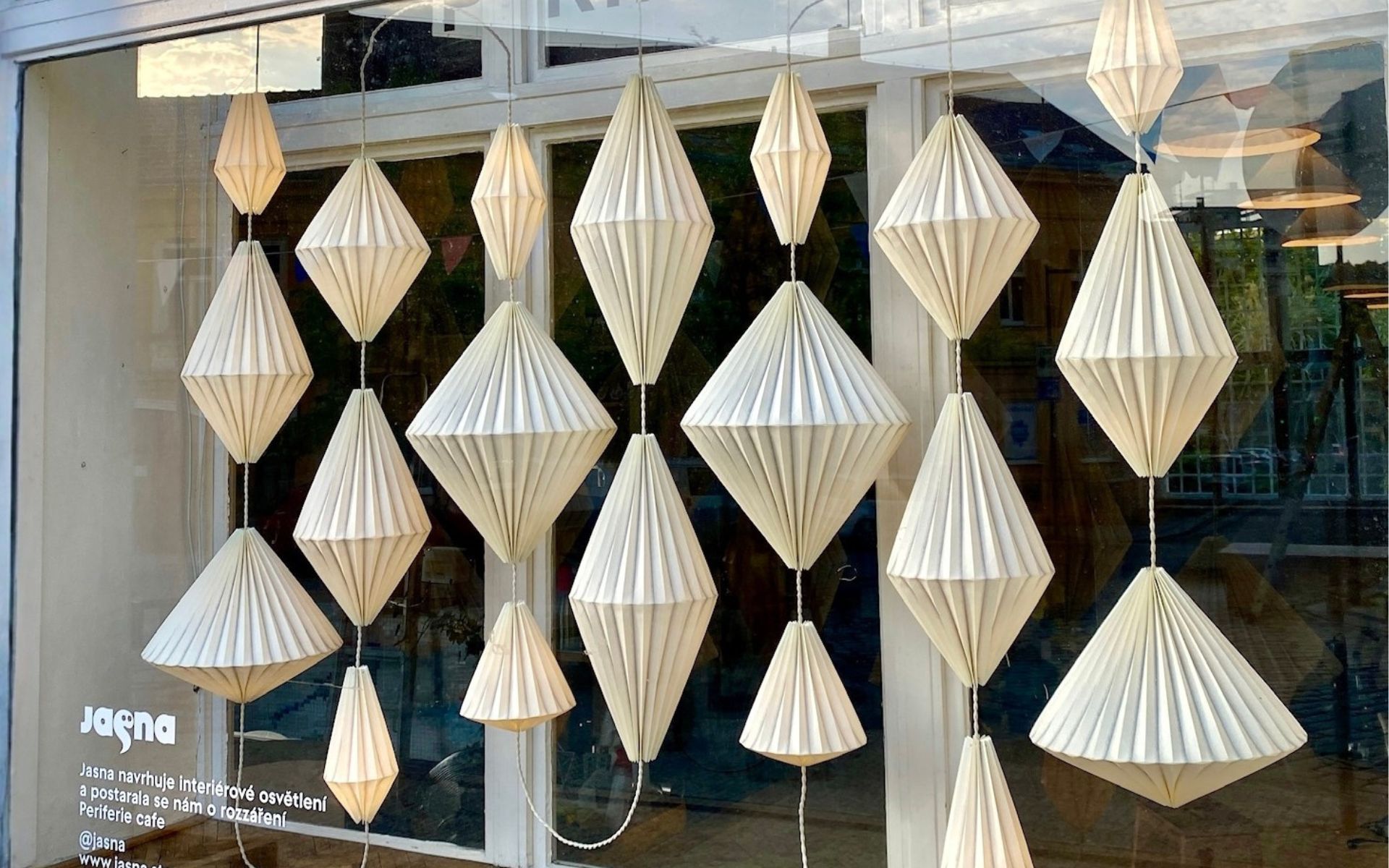 Světelná instalace ve výloze Periferie Café v pražském Braníku