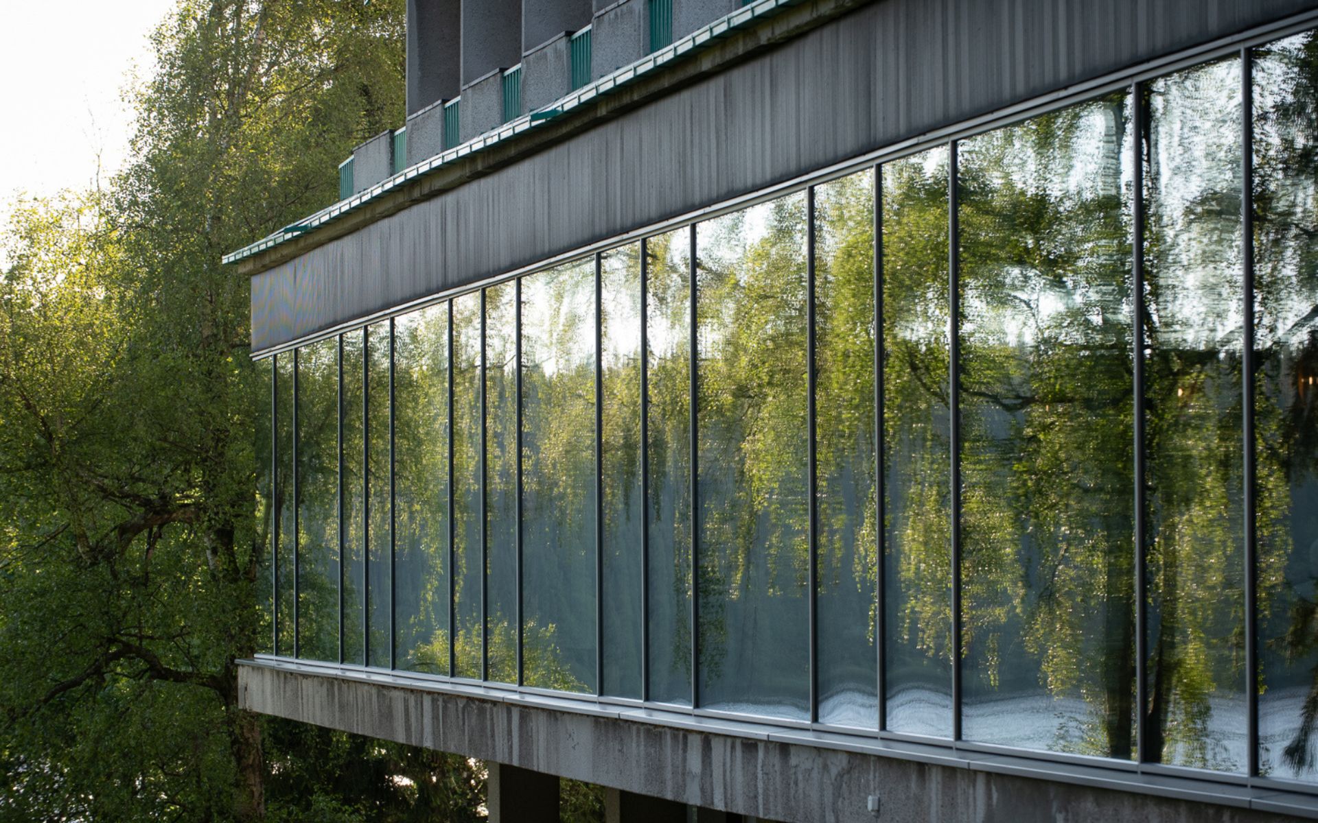 Dominantou bruselské části hotelu je 68 metrů dlouhá prosklená fasáda, která běží bez jediného překladu a je vytrčená ven z budovy