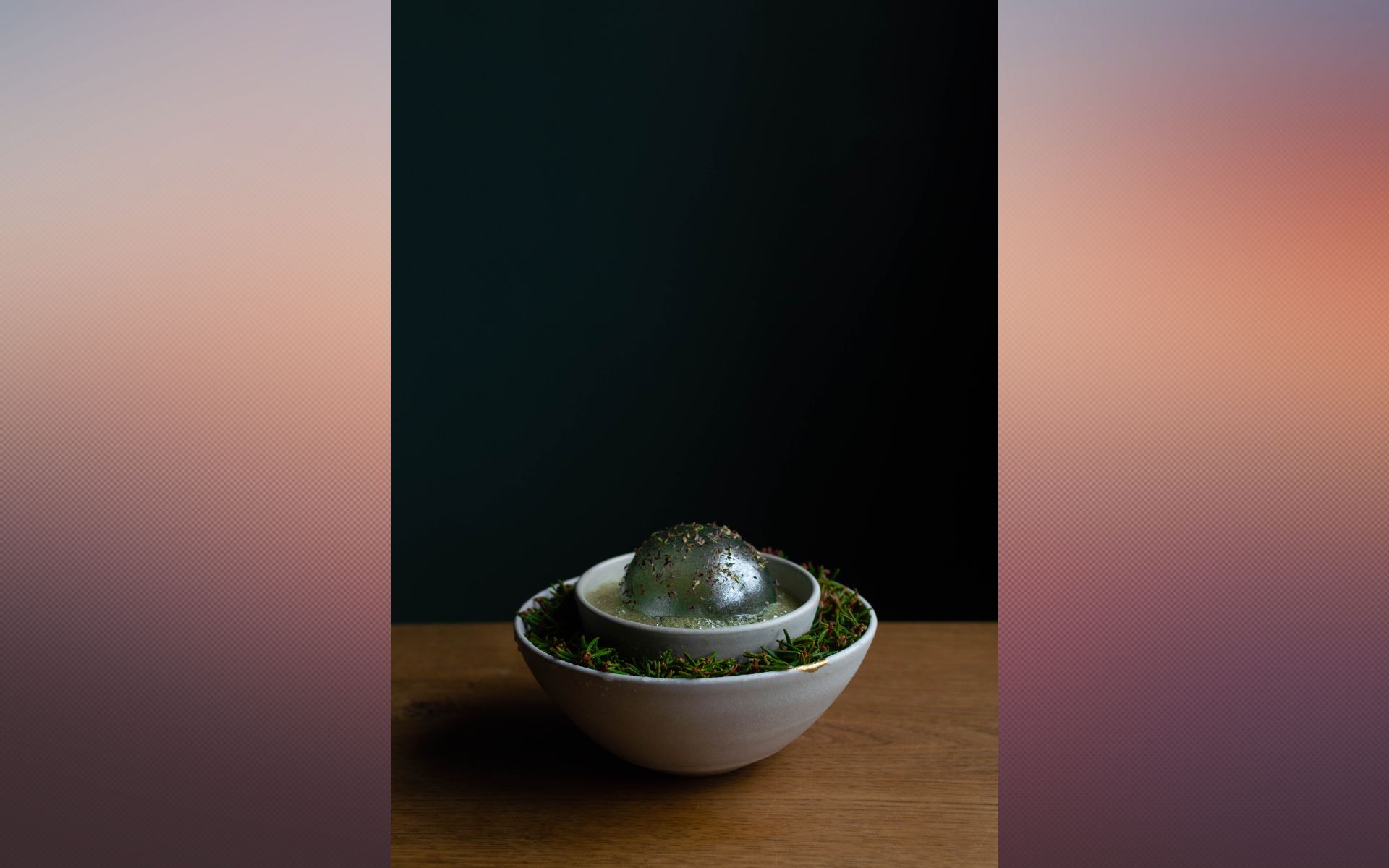 Cukrová sféra se sorbetem z byliny bog labrador alias rojovníku grónského