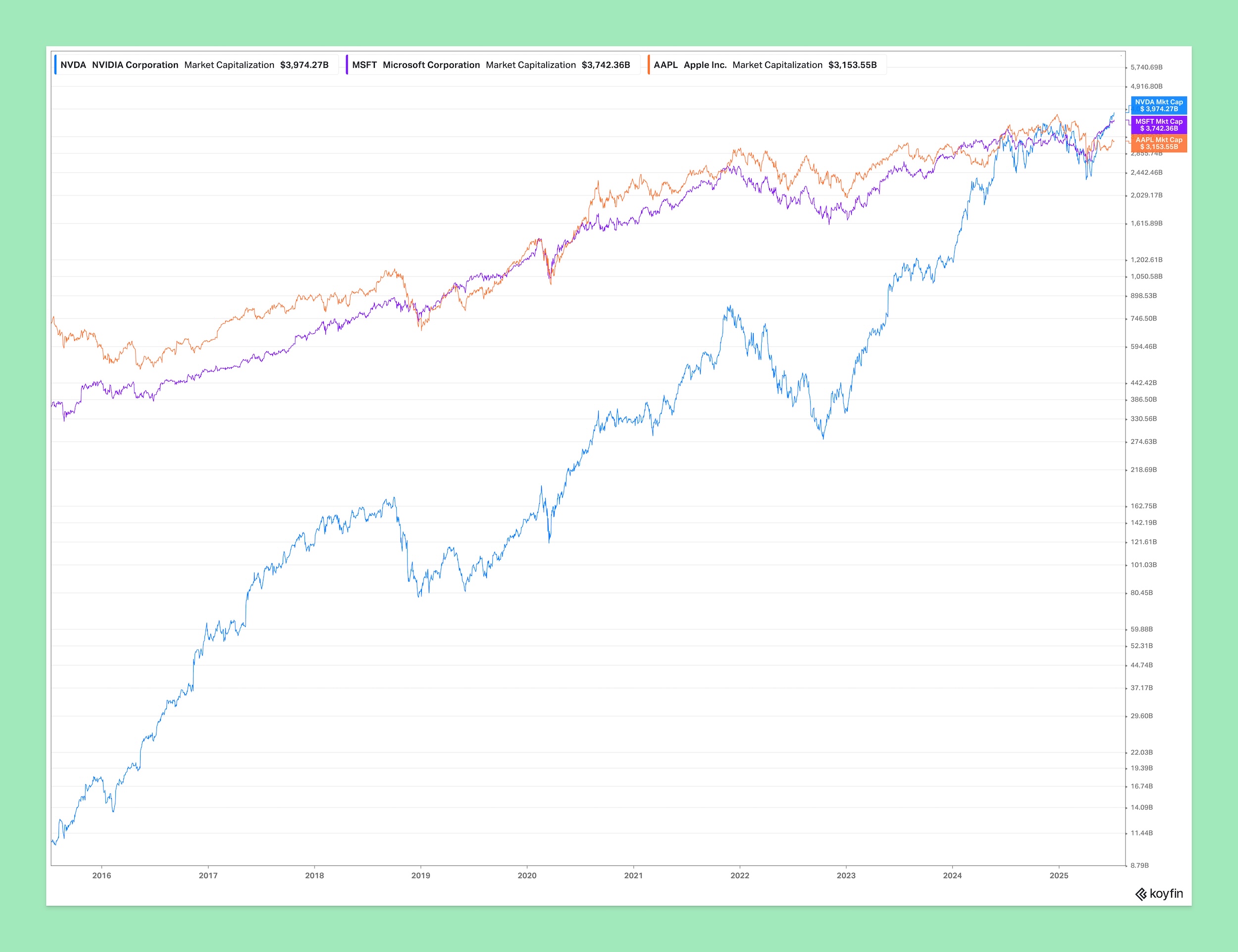 Vývoj tržní kapitalizace Nvidie (modrá), Microsoftu (růžová) a Applu (oranžová) na grafu Koyfin
