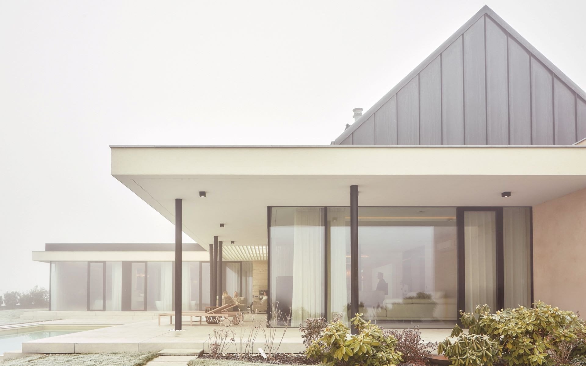 Černé rámování oken a sloupky tvoří kontrast ke světlým tónům domu