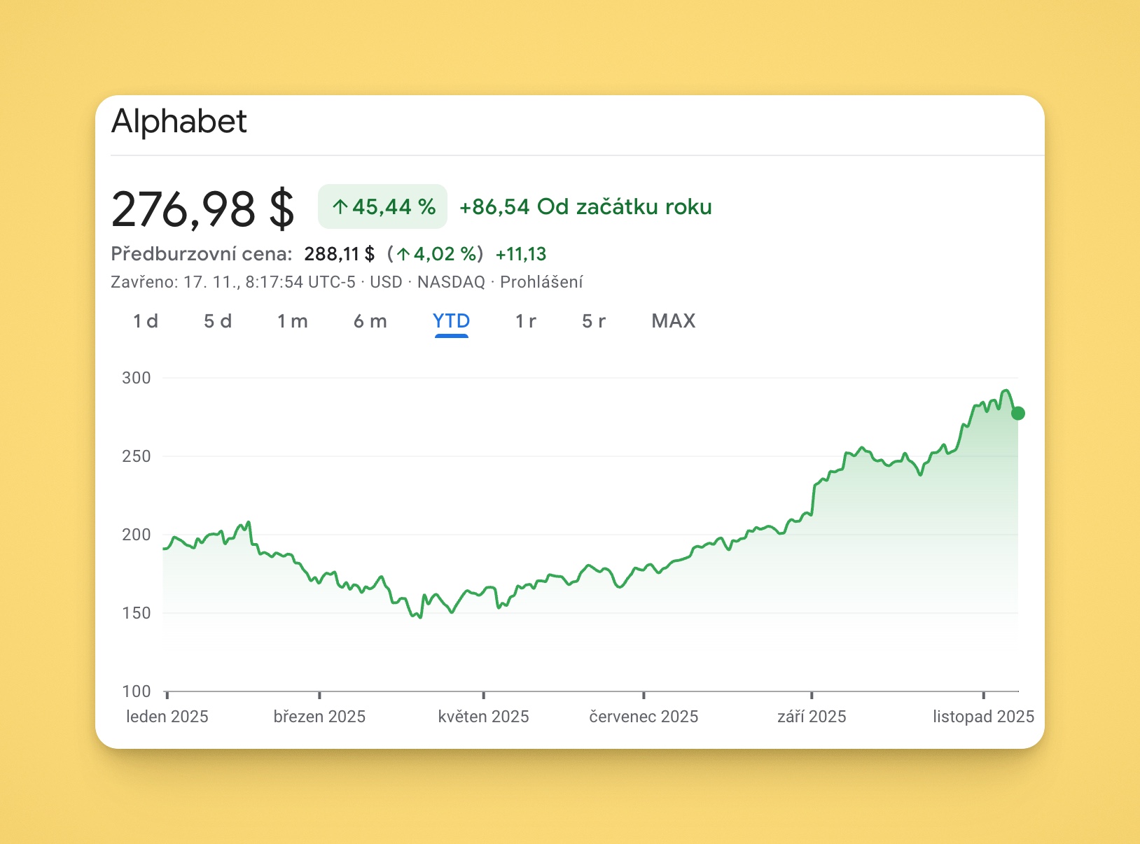 Vývoj ceny akcií společnosti Alphabet od začátku roku na grafu Google Finance